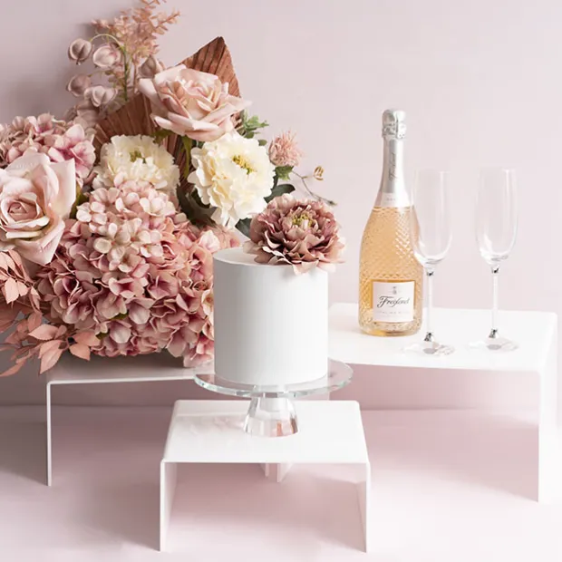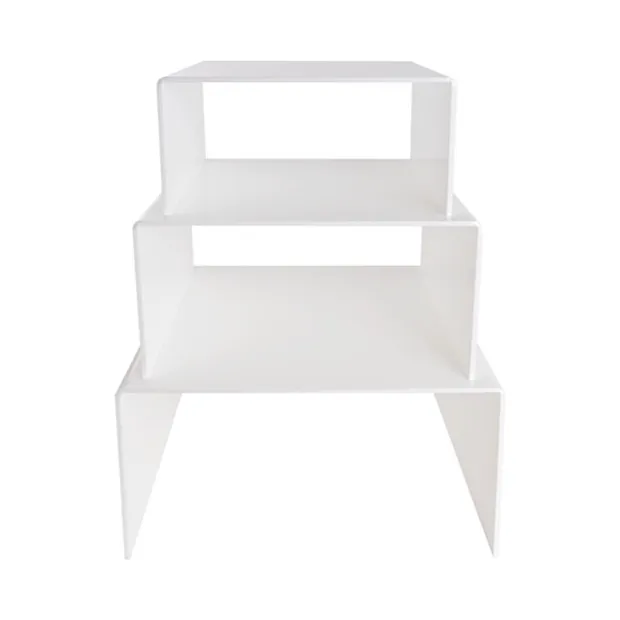 The smallest riser measures 24.8cm wide, 25cm deep, and 11.7cm tall. The medium riser measures 29.7cm wide, 30cm deep, and 14.8cm tall. The largest riser measures 35cm wide, 35cm deep, and 17.7cm tall.