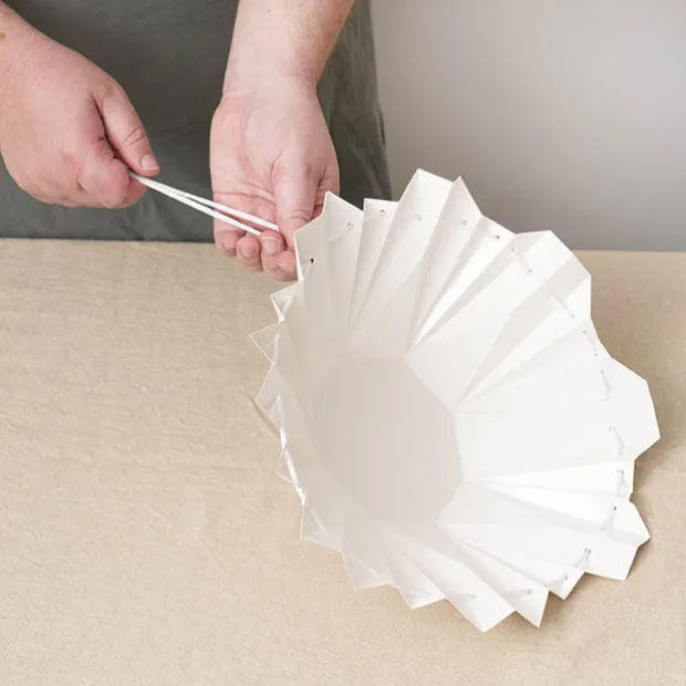 The pod is 13.8cm wide at the base and 14.4cm tall. They are flat-packed and pre-scored/pre-folded. The threaded rope helps you to pull the pod up and into place to surround your arrangement. Giving a lovely fluted designer look.