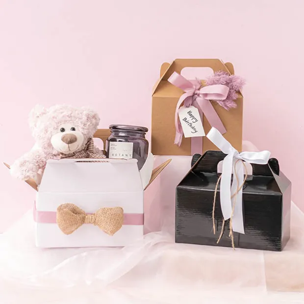 Can be used for sweet or savoury fresh food, canned/dry goods or other gifts. When using with patisserie food, please use with Food Grade shred or paper. If using with greasy or oily food, please use wax proof paper and/or aluminium foil along the base. Do not let hot or greasy goods stand inside for extended periods as it is a cardboard box designed for transport and short display.