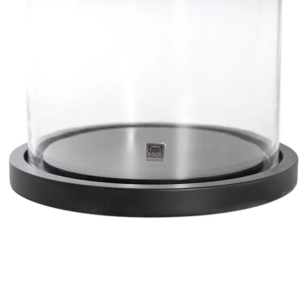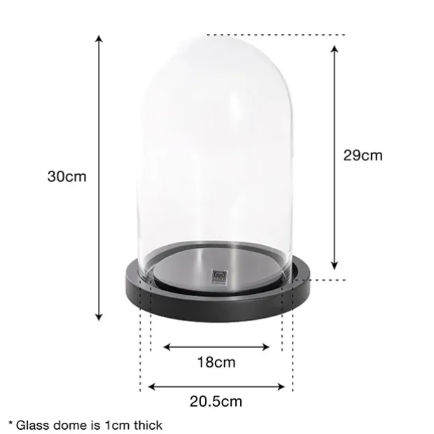 Made up of glass cloche and wooden MDF black gloss base. Base measures 23.5cm in diameter and overall height of cloche and base together measures 30cm. Internal space between base and cloche top measures 29cm tall and 19.5cm wide. Base plate has internal platform that measures 18cm wide. Outer cloche diameter measures 20.5cm. Sold individually.