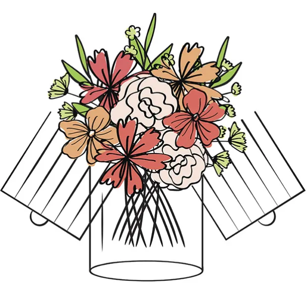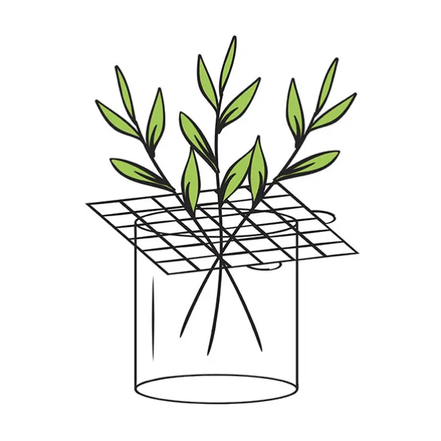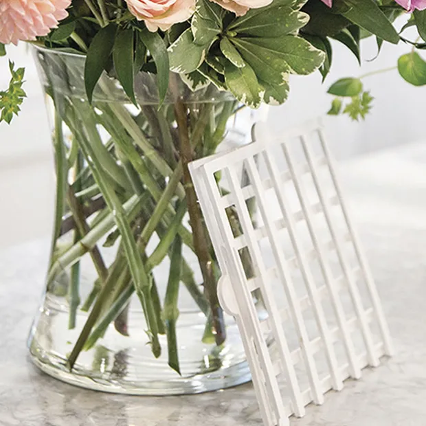 To use this product, slide the pieces together to create a grid. Place the grid over the opening of a vase filled with water. Insert flowers into the grid until happy with their arrangement. If you’re not tying the bouquet together, simply pull the grid pieces away from each other, and enjoy your arrangement. If your arrangement is to be tied, slightly lift the grid pieces, taking care not to pull them apart, and hold your arrangement at its neck. Gently slide out the white grid pieces, taking care not to disrupt the arrangement. As the grids slide out, make sure to compensate with a slightly tightened grip. Then tie bouquet as usual.