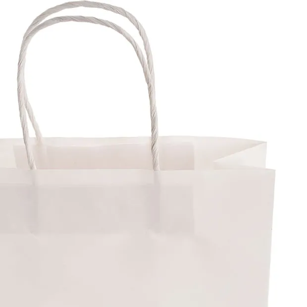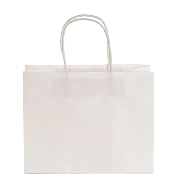 Available in a pack of 10, each bag measures 120gsm thick, can bear up to 14kg, features twist handles, and a flat base for easy packing. Also available in brown and a range of sizes, this bag measures 350mm tall, 450mm wide, and 100mm deep in the gusset