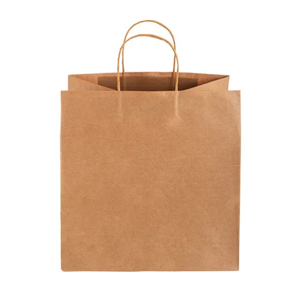 Flat-based, it sits upright on a counter for easy packing of goods. Perfect for food takeaway, it features tight-twist paper handles.