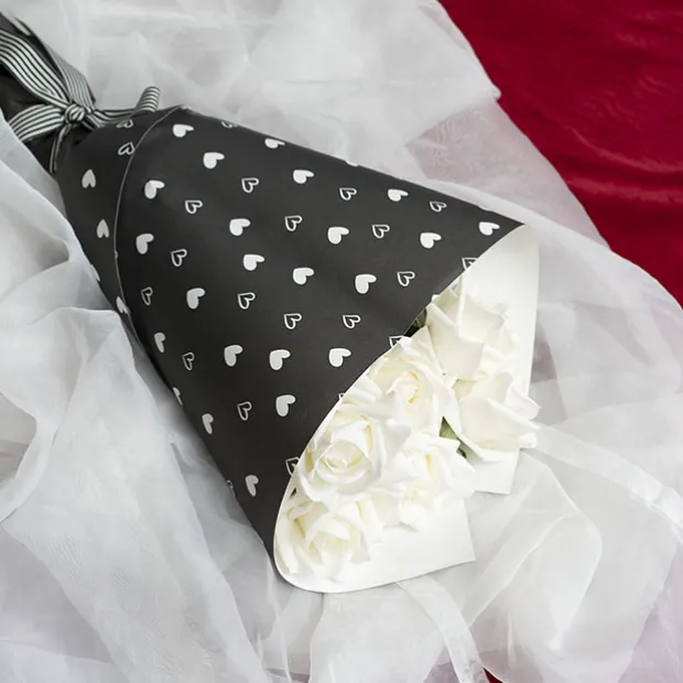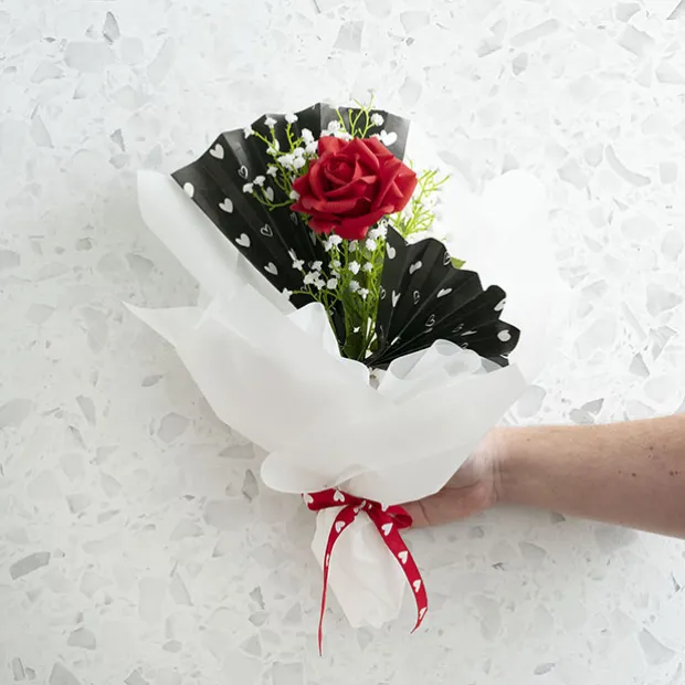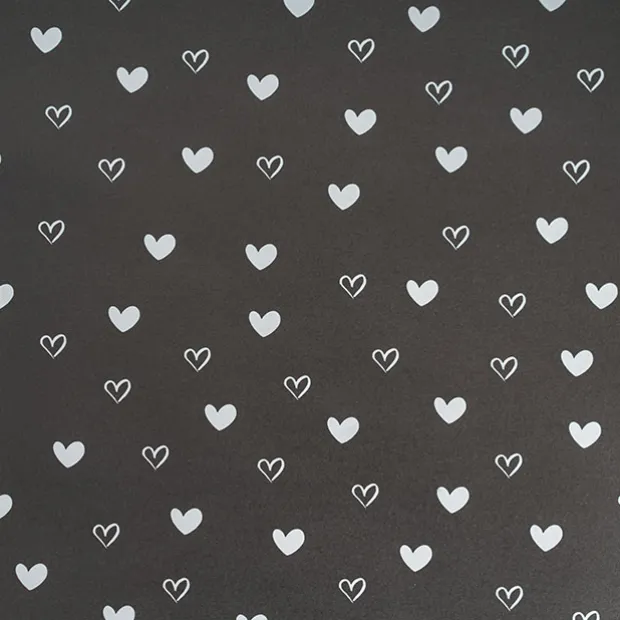 In lush black on the front with white heart print it’s back is a crisp white which is sure to give your bouquets and hamper or gifts a lovely finish this Valentine’s Day.