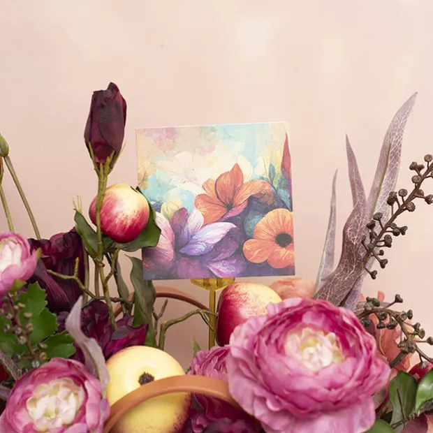 This Nouvelle card has a square layout with side fold, so the card will stand upright for display. The side fold design provides a premium feel and the square design adds extra space on the inside for you to convey heartfelt messages or well wishes.