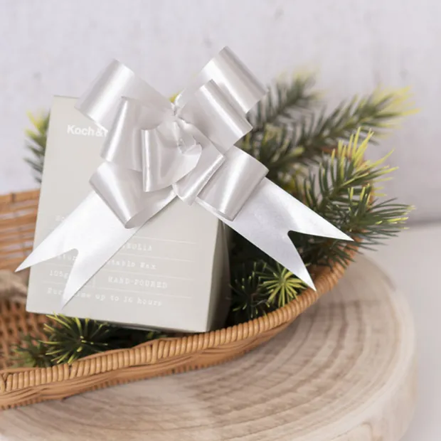 To assemble, this bow employs a simple and unique pull mechanism. Simply remove from the packaging, locate and pull the two inner narrow lengths while holding the thicker tails apart, and viola! You have a beautiful bow. The two thin tails can be used to tie to your bouquet, hamper or gift and each measure 45cm in length.
