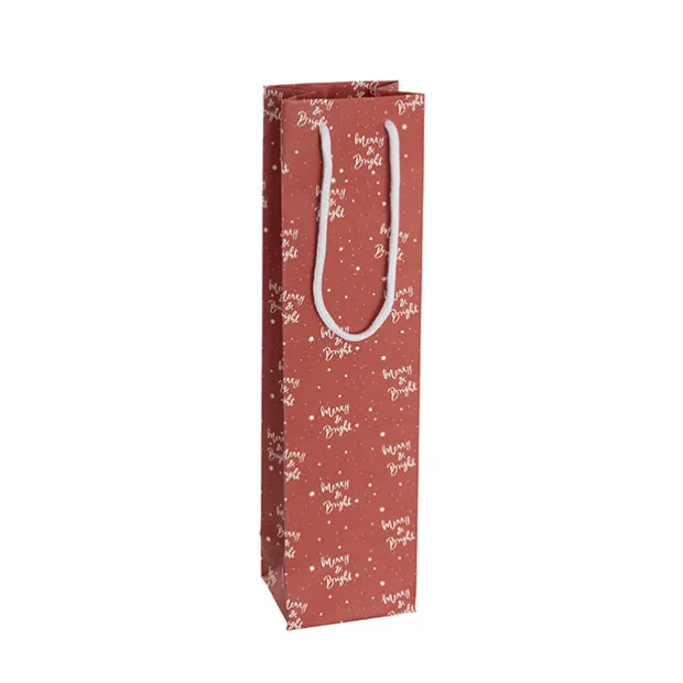 This bag measures 11cm wide, 9cm deep, and 42cm tall, and can contain up to one bottle of wine. The front and back handles are 7.3cm wide and 2.8cm high. The handle sits 2cm from the top with a space of 37cm below the handle and the handle is 1.7cm from the edge of the bag. This product is available in a pack of five.