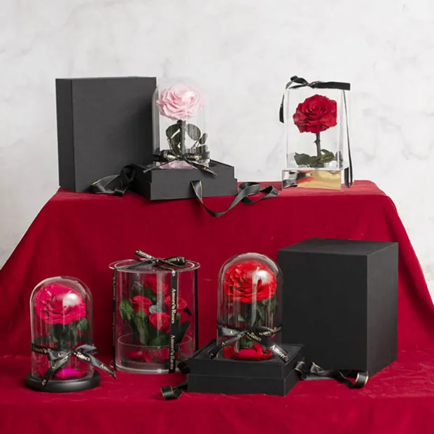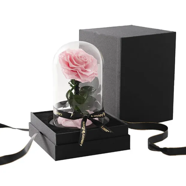 The rose head measures between 8.5 to 9cm in diameter and the cloche measures 12cm in diameter and 20cm tall. The glass dome is not fixed onto the wooden base, so the rose can be displayed with or without the glass dome.