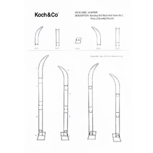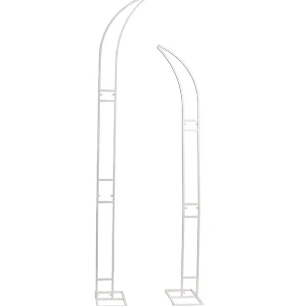 This set of curved metal arch backdrops includes a grand 210cm tall arch and a slightly smaller 250cm tall arch, each supported by a stable base measuring 25cm long and 40cm wide. This product requires some simple assembly with screws.