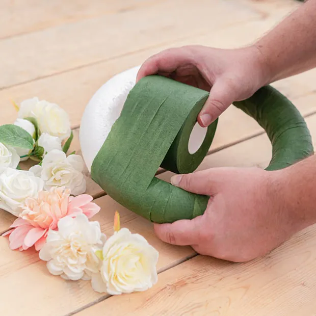 Loop this tape firmly around the circumference of your wreath to create a barrier that will help keep your styrofoam base from crumbling as you insert stems into it. This green tape also helps to camouflage any gaps in flowers or foliage, thanks to its dark green colouring.