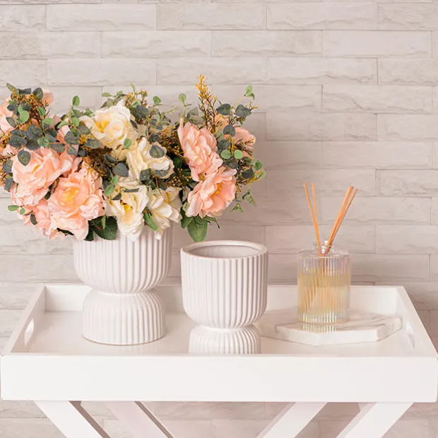 This piece measures 15cm at its widest point and 20cm tall. The bottom ‘foot’ component measures 7.5cm tall, and the vessel itself measures 13cm tall. Each vase is sold individually and is available in two sizes and four other complementary colours.
