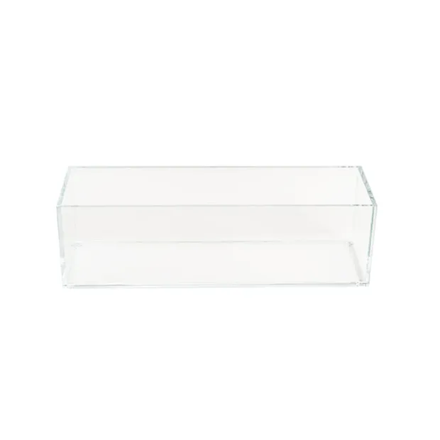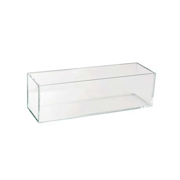 This clear vase measures 6mm thick, 40cm wide, 12cm deep, and 12cm high. Internally, this vase measures 11.5cm tall, 39.3cm wide, and 10.8cm deep. Each corner of the base has a clear rubber pad. This vase is also available in a smaller size.