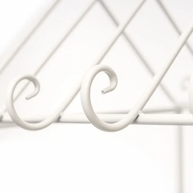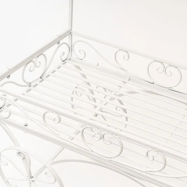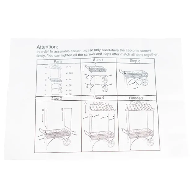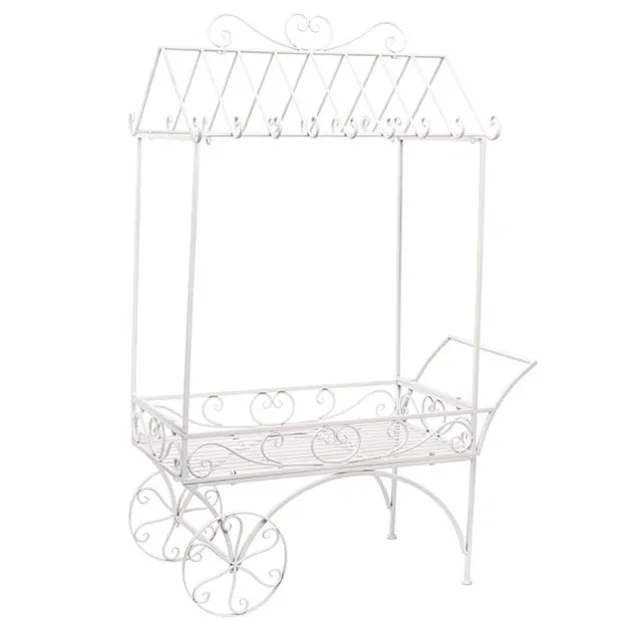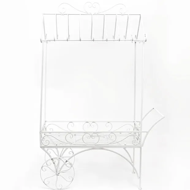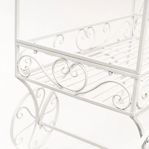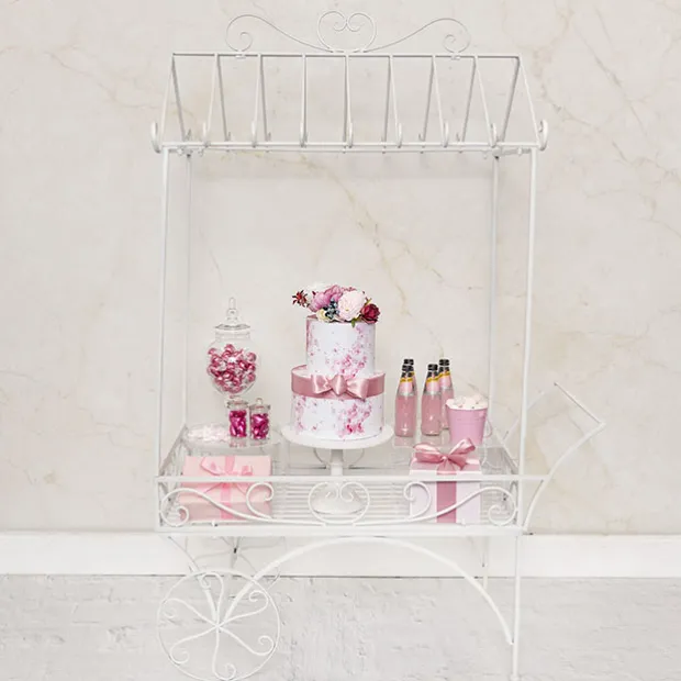Featuring a rectangle tray measuring 88cm x 50cm which can be used as a dessert table or to show off your stunning floral arrangements. On the top, the cart has nine hooks on either side where you can hang flowers and greenery in pots or drape garlands throughout. The wheels and handle do not move once assembled. The display cart comes flat packed with easy to assemble instructions. Made from metal material.