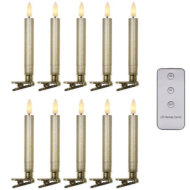 Each candle is powered by 1 x AAA battery, which is not included. Each candle measures 12.5cm tall and 1.5cm in diameter. The 3key remote functions with ON/OFF/TIMER, powered by 1 x CR2025 button cell, which is included. These LED candles are available in a pack of 10.