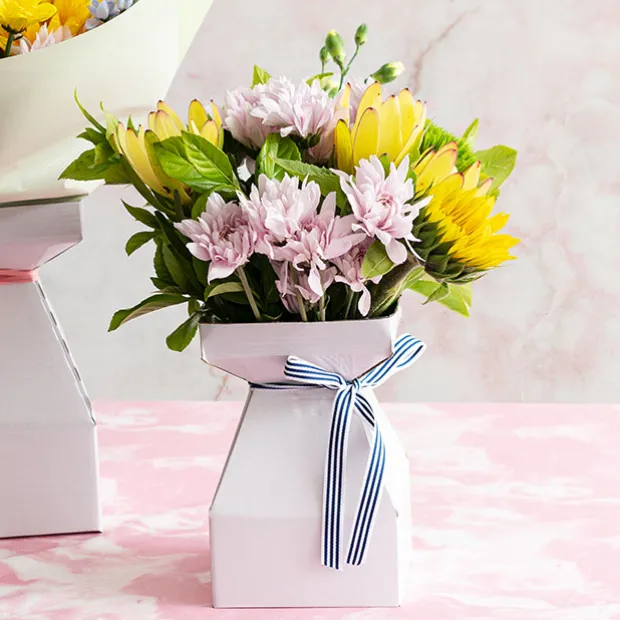 Complete with a flat base, these pods offer a stable packaging solution that aids in transportation of bouquets. They also offer easy vase-less display of flowers. Recipients will no longer need to scramble for a vase if they receive an arrangement away from home, at the office or hospital.