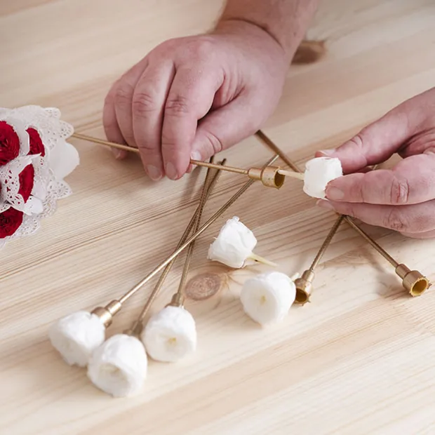 These gold plastic flower stems are ideal when working with preserved rose heads. Use them to display preserved roses of chocolates in your chosen container, whether it is an acrylic gift box, cardboard square box, or a round hat box.