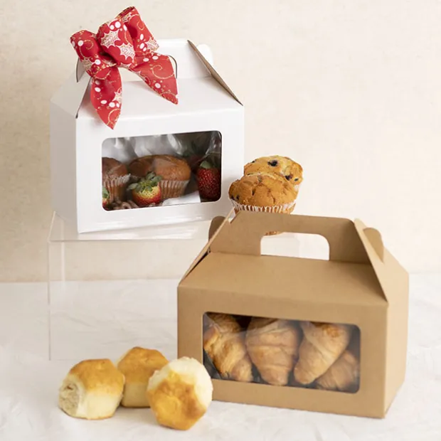 Can be used for sweet or savoury fresh food, canned/dry goods or other gifts. When using with patisserie food, please use with Food Grade shred or paper. If using with greasy or oily food, please use wax proof paper and/or aluminium foil along the base. Not recommended for use with hot foods as the window will fog up.