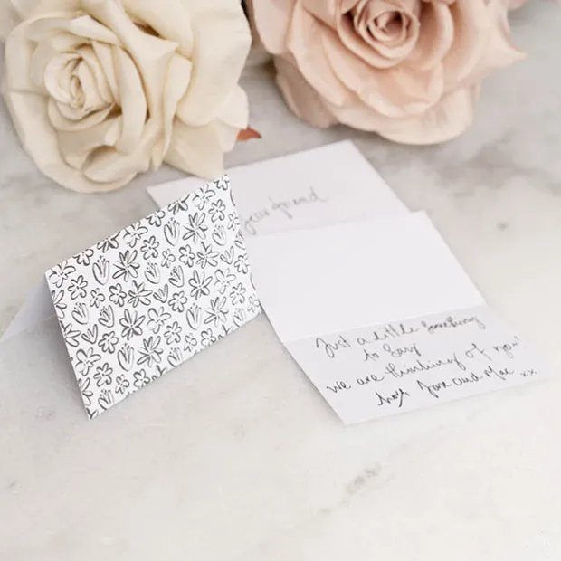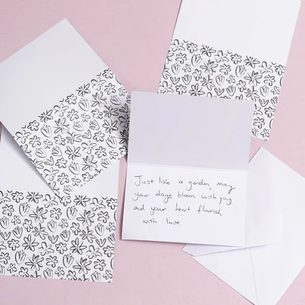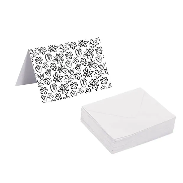This pack includes 25 folded cards, along with 25 white envelopes. Each card measures 10cm wide, 6.5 cm tall when folded, 13cm when flat.