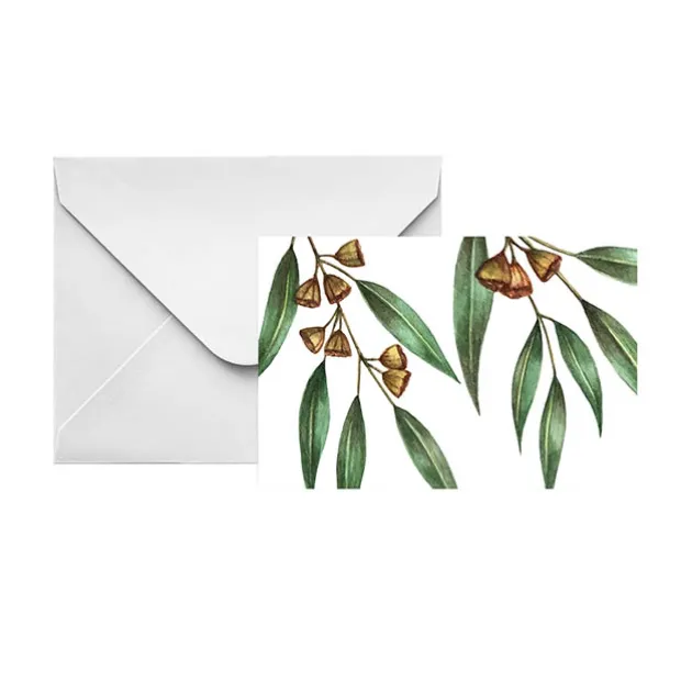 This top folding card has a native print of gumnut leaves and nuts on the front creating a striking gift card.