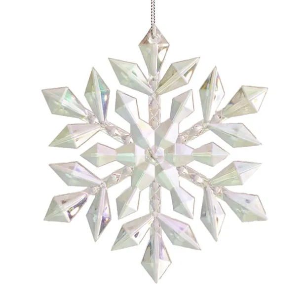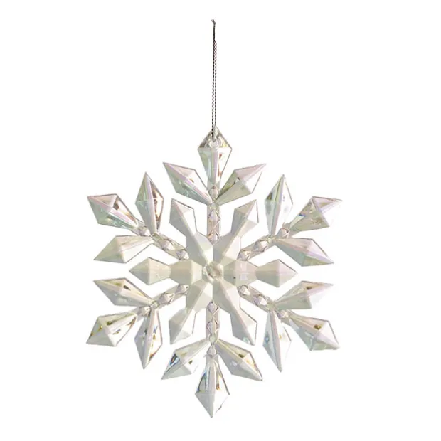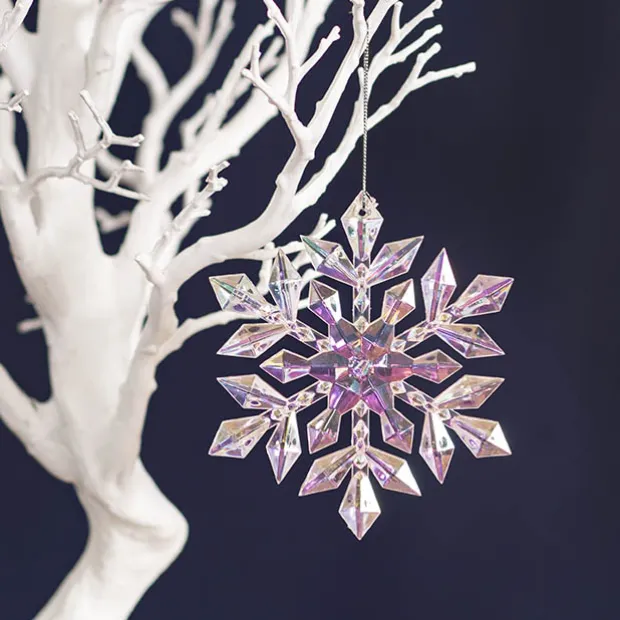 Place this snowflake decoration next to ambient lighting to optimise the iridescent shimmer finish of this classic piece. Perfect for hanging from a tree, garland, or gift, this piece also works well in table displays and festive centrepieces.