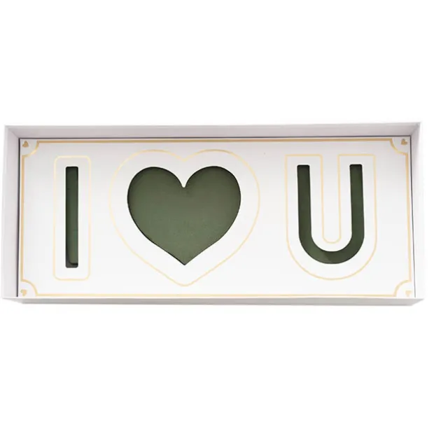 It features a black base, a black and gold cut-out insert, a black lid, and a clear tray with foam. The base includes a plastic tray that holds floral foam, topped with a cardboard insert featuring the “I Heart U” cut-out and gold, decorative trim. The insert is adorned with a gold border for an extra touch of elegance.