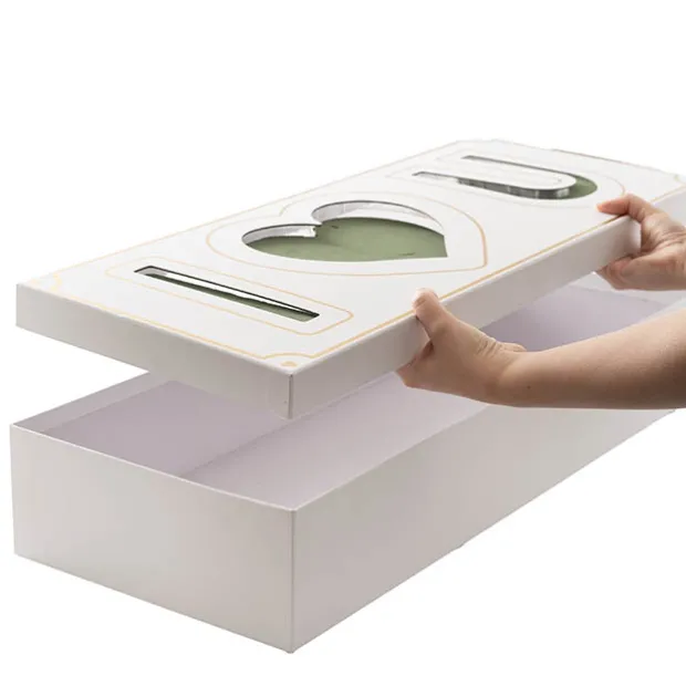This rose box measures 61cm wide, 26cm deep, and 11cm tall. Sold individually, the box includes the plastic tray, “I Heart U” cut-out, and foam.