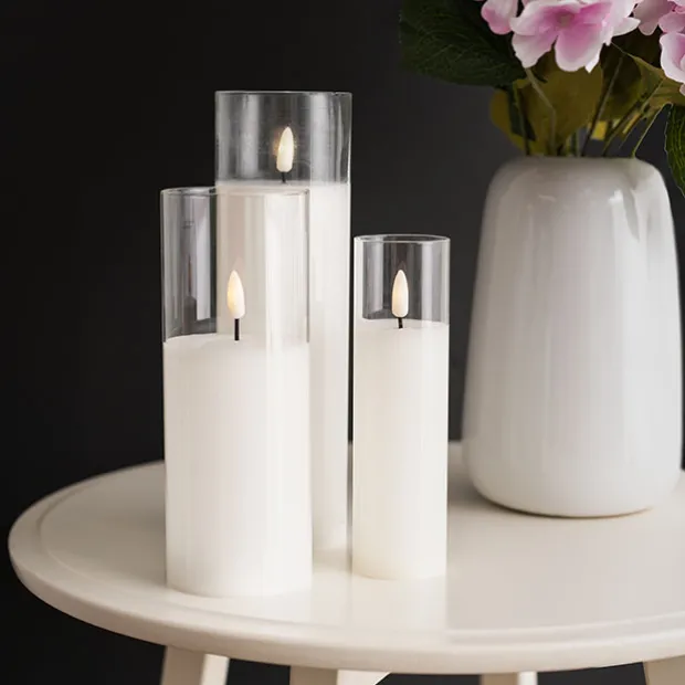 Be mesmerised by the magic of LED candles. This Glass Trueflame™ Flickering LED White pillar candle gives a cosy ambience like a real candle. It is a safe alternative to decorate your home, weddings and any special events. Featuring a glass holder filled with real wax, long battery lighting life and a realistic flameless glow.