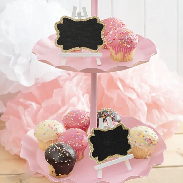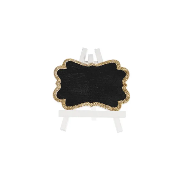 Each chalkboard features a gold-coloured scroll border and a three-legged easel with a hinged top. Measure 7cm wide x 8cm in height. Available in a pack of 6.