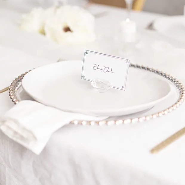 Please note, that the groove in the holder isn’t deep enough to hold thin cards straight. Cardboard cards will sit at a slightly tilted angle. If you prefer your place card to stand straight we suggest using a small acrylic sign as this is thicker.