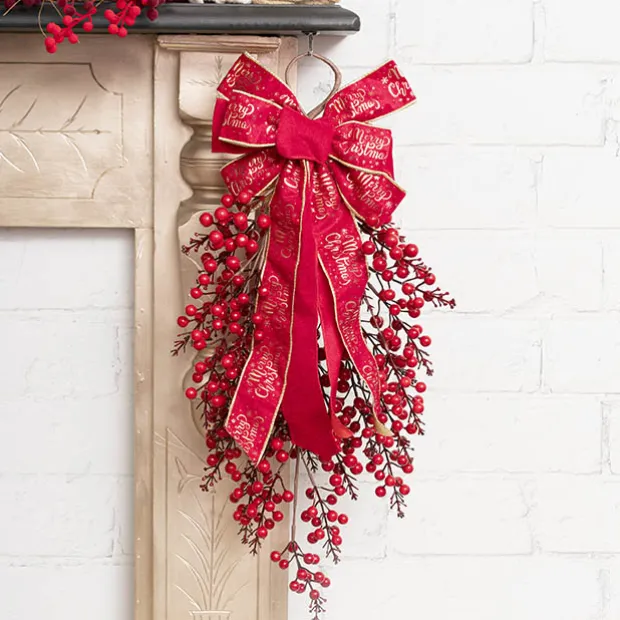 Red velvet ribbon with Gold Merry Christmas print in gold foil and gold edge. Ribbon is 60mm wide and has 6 loops at the top.