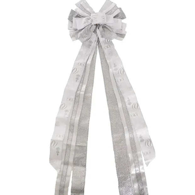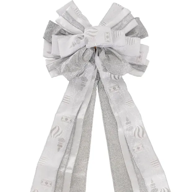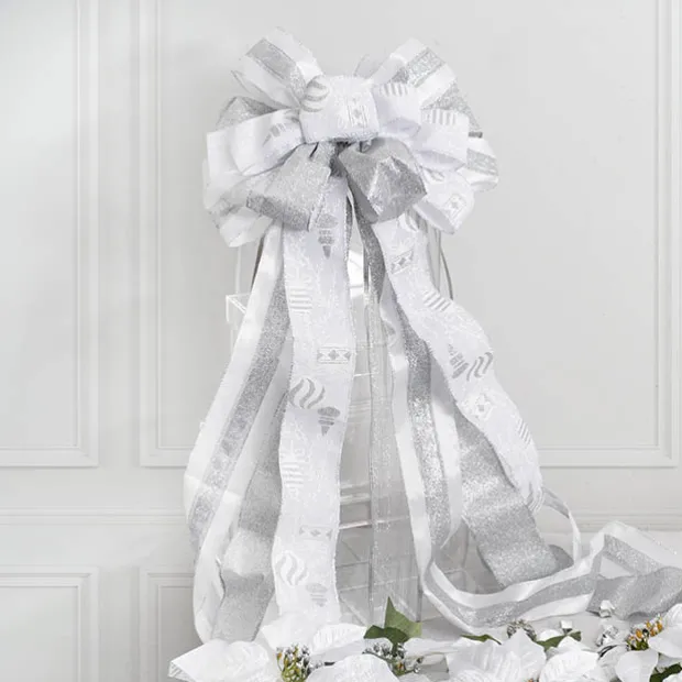 White satin & silver glitter ribbon that is 60mm wide and has 4 loops at the top.