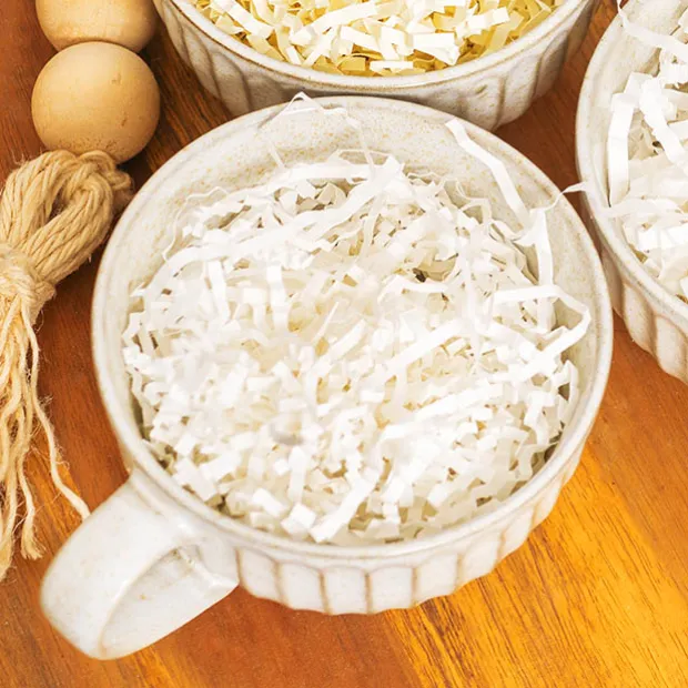 Our range of premium, A-grade virgin quality paper is cut using specialised blades to ensure a full and fluffy shred. This also means there is minimal dust, paper waste, or residue coming off the shred when unpacked. Another key benefit to having quality bouncy shred is that less is needed to fill up your hamper or presentation boxes.