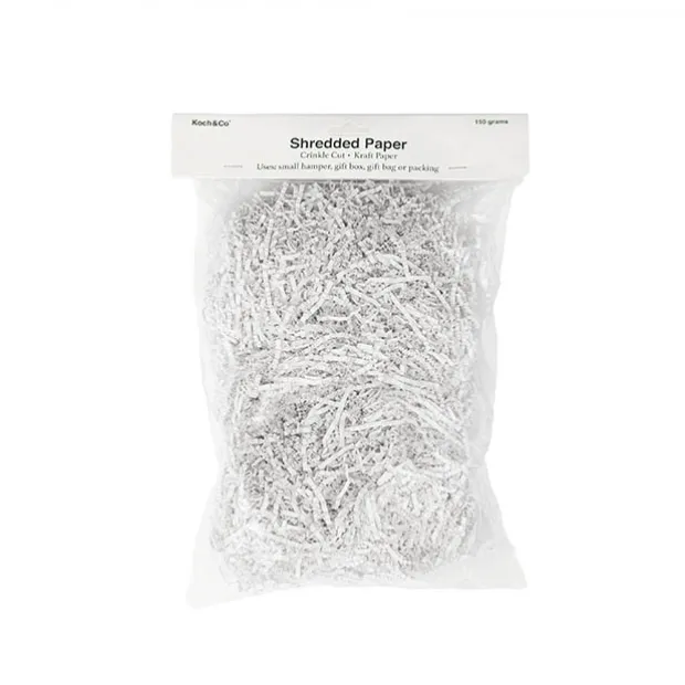 Our shred is composed of 3mm wide crinkle-cut strips and made from 80gsm paper. It is available in 150-gram bags.