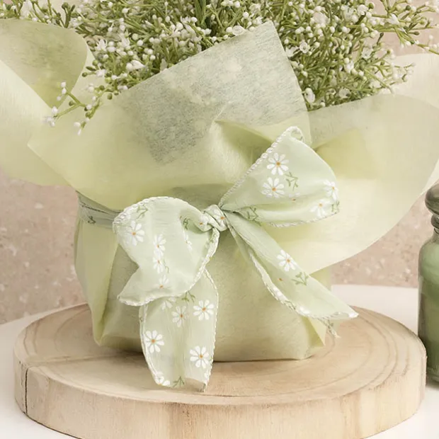 Thanks to the sheer nature of this fabric, this ribbon is well-suited to layering on top of solid ribbons for added dimension and increased colour contrast.