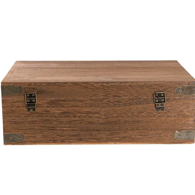 This Triple Wooden Wine Box in Antique Brown has a rustic, antique look. Complete with a hinged lid, locking latch, metal handles and metal features on the corners, this box has a brown stain and smooth polish finish on 8mm real timber.